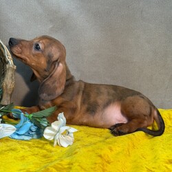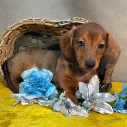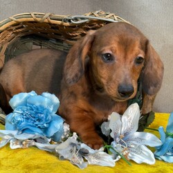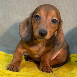 Hi, I'm Atlas! I'm a 12-week-old male Dachshund with a beautiful red dapple coat, born on July 3, which makes me a Cancer pup. I am ready now to plan my trip to my forever family. I'm AKC registered. I will make your life a little fluffier and a lot happier.
