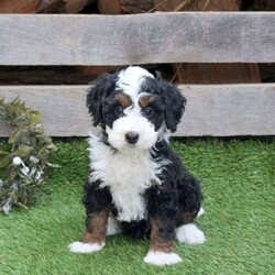 Honey is a playful Miniature Bernedoodle puppy who loves to have fun! This sweet natured pup is well socialized and ready to meet you! Honey will come home with a 30 day health guarantee plus an extended genetic health guarantee, both provided by the breeder. This cutie has also been seen by a vet and is up to date on shots and de-wormer.