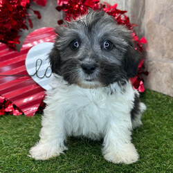 Hi, I'm Saffron! I'm a 10-week-old male Havanese with a beautiful black brindle coat, born on November 28. I am ready now to plan my trip to my forever family. Once I reach my adult size, I'm expected to weigh between 10–14 lbs. I'm AKC registered. My heart is as big as my paws are tiny, and I'm ready to love you.