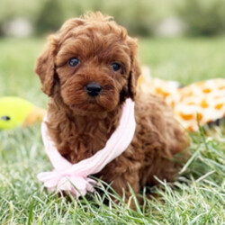 Hi, I'm Daphne! I'm a 5-week-old female Cavapoo. My dad is a Poodle and my mom is a Cavapoo. I have a beautiful red coat, and I was born on March 1. I'll be ready to go home to my forever family after April 26, once I'm grown enough to leave my litter. When I reach my adult size, I should weigh between 7–16 lbs. My little paws are ready to make big imprints on your heart.