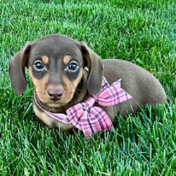 Hi, I'm Tulip! I'm a 7-week-old female Dachshund with a beautiful chocolate & tan coat, born on March 3. I'll be ready to go home to my forever family after April 28, once I'm grown enough to leave my litter. I'm ACA registered. I will make your heart as full as mine is with love.