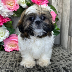 Hi, I'm Patch! I'm a 12-week-old male Shih Tzu with a beautiful brindle & white coat, born on January 24. I am ready now to plan my trip to my forever family. Once I reach my adult size, I'm expected to weigh between 9–12 lbs. I'm AKC registered. I can't wait to be your best friend and cuddle buddy for life.