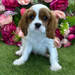 Hi, I'm Bandit! I'm a 12-week-old male Cavalier King Charles Spaniel with a beautiful blenheim coat, born on January 12. I am ready now to plan my trip to my forever family. Once I reach my adult size, I'm expected to weigh between 8–23 lbs. I'm AKC registered. I'm all set to bring joy, love, and a wagging tail to your life.