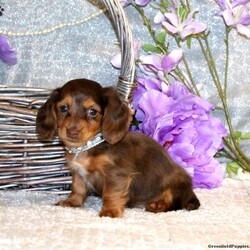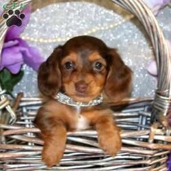 Elliot is a socialized and sweet natured Miniature Dachshund puppy who can be registered with the ACA! This precious and petite pup comes home with a 30 day health guarantee and an extended genetic health guarantee, both provided by the breeder. Elliot has also been seen by a vet, is up to date on shots and de-wormer, and will be microchipped. This cutie is ready to meet his forever family, so call Christine Sauder today and schedule your visit!