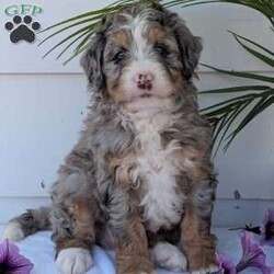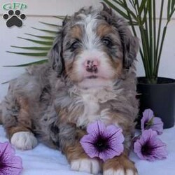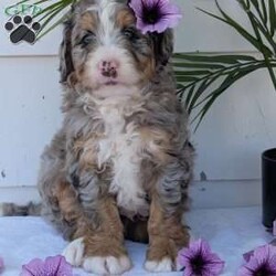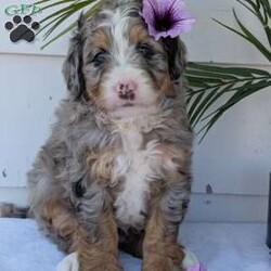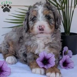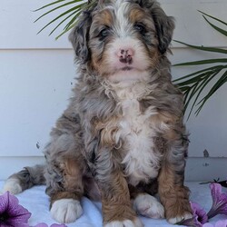 Hey everyone! Meet our precious little guy, Mini Bluey. he is a beautiful F1 blue-merle mini Bernedoodle with a beautiful coat of soft wavy hair. His mom is a beautiful Bernese mountain dog and dad is a handsome blue-merle tri-colored mini poodle. Bluey will be between 25 and 35lbs fully grown. he has a super sweet temperament and loves giving kisses, he is sure to wag his way right into your heart! he is very well socialized and loves to run around and play! he would make the perfect companion to anyone giving him a loving home. he is a very happy and healthy little pup! he will be available to his new home on October 4th.