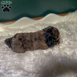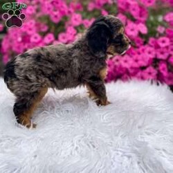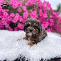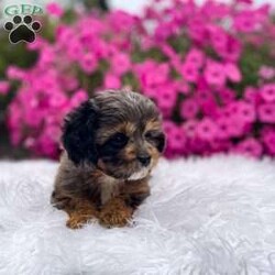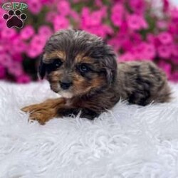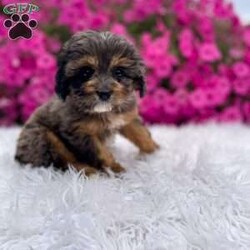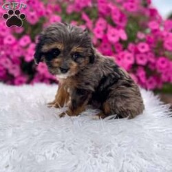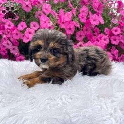 Meet Teddy. I am a 4 colored cavapoo puppy. I am blue Merle, brown, white, and black. I love to be cuddled and played with.