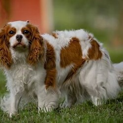 is a beautiful female F1 Cavapoo with a soft red and white coat, giving her a warm, gentle appearance and an expressive, affectionate look. She is being raised in a hands-on family environment with daily interaction and early socialization to help her grow into a confident, well-adjusted companion.