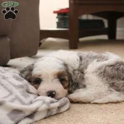 Meet Colin! He is a beautiful merle and white Cavapoo with striking blue eyes that will melt your heart. With a soft, wavy coat and a gentle, affectionate temperament, this little one is the perfect blend of playful and cuddly.